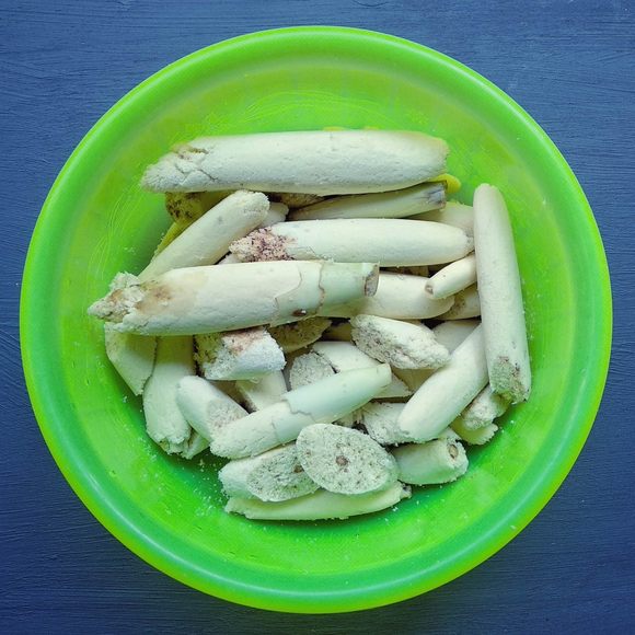 Duruka, also known as Fiji asparagus, is the unopened flower of the Saccharum edule plant, a type of sugarcane. It's a sweet, crumbly vegetable with a flavor similar to corn. The flower is typically sold still bundled in its sheath and is commonly used in Fijian cuisine